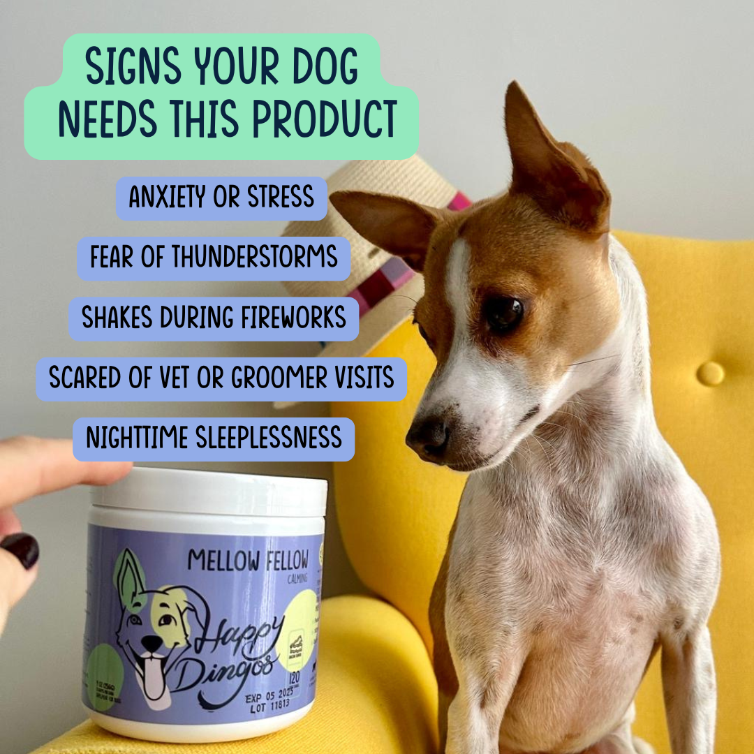 Calm your pup with Mellow Fellow! This chewable dog ⚡️supplement helps to reduce stress & anxiety with all-natural Hemp, Valerian Root and Chamomile. Perfect for everyday relaxation and those extra 🤯 moments - like thunderstorms, 🧨 fireworks, or visits to the groomer. Now in a convenient travel size pouch with 16 soft chews for all your life's adventures. Helps your dog have more 😌 chill so you can too!
